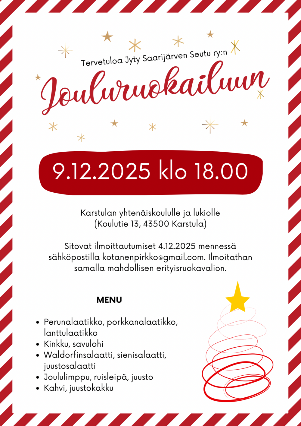 Syyskokouksen alussa syödään jouluruoka. Mikäli et ole jo ilmouttautunut, niin vielä kerkiee. Sitovat ilmoittautumiset 4.12.2025 mennessä sähköpostilla kotanenpirkko@gmail.com. Ilmoitathan samalla mahdollisen erityisruokavalion.